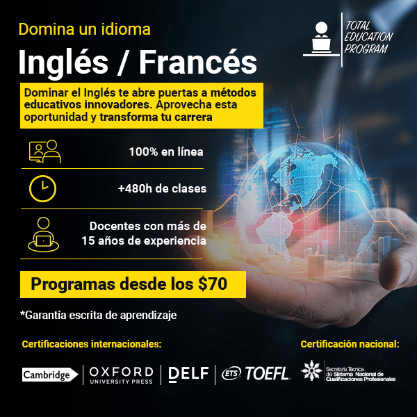 El programa de inglés de Total Education Program (TEP) ofrece clases en vivo con horarios flexible-fijos, enfocándose en conversación y preparación para certificaciones internacionales como FCE Cambridge o TOEFL. Incluye refuerzos sin costo, material interactivo y una metodología práctica para desarrollar fluidez, comprensión y confianza en contextos profesionales y académicos.